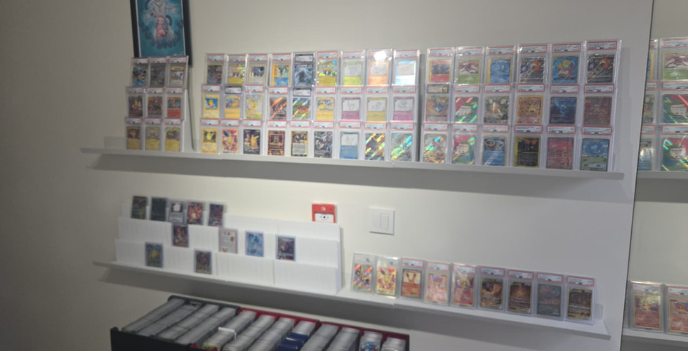Our physical store is officially open! Behind the colorful window logo you’ll find rows of PSA-slabbed cards, binders packed with singles, and a cozy table where collectors sit, chat, and browse. Just like in the photos: a compact space with a big heart—figure displays in the window, graded walls inside, and plenty of binders to explore.